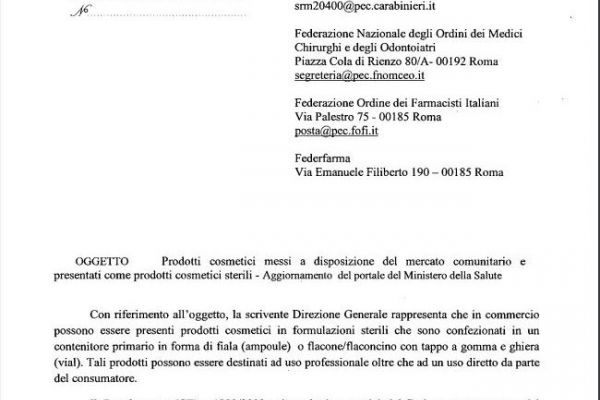 In data 23 aprile 2019 il Ministero della salute ha rilasciato una comunicazione sui prodotti cosmetici messi a disposizione del mercato comunitario e presentati come prodotti cosmetici sterili.