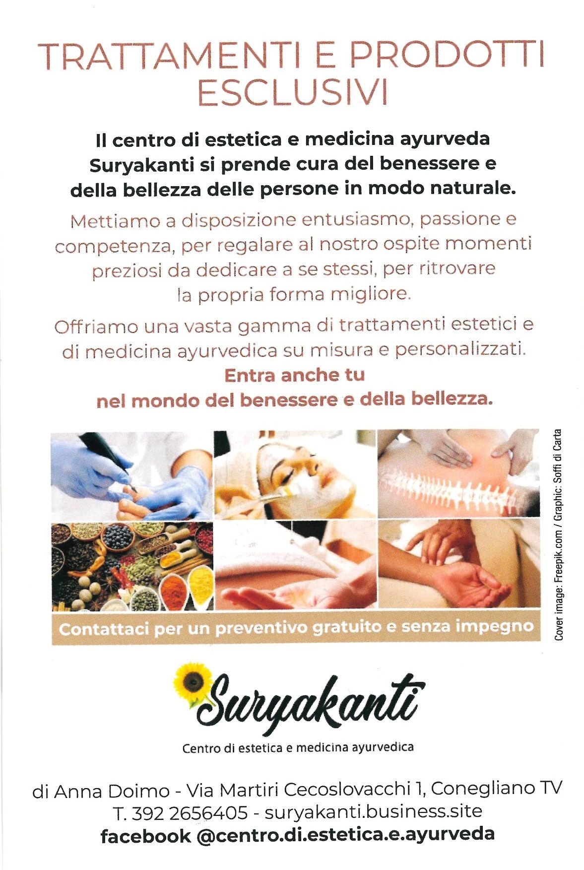 Ecco come si presenta: "Il centro di estetica e medicina ayurveda Suryakanti si prende cura del benessere e della bellezza delle persone in modo naturale. Metto a disposizione entusiasmo, passione e competenza, per regalare al mio ospite momenti preziosi da dedicare a se stesso, per ritrovare la forma migliore. Offro una vasta gamma di trattamenti estetici e di medicina ayurvedica personalizzati. Per conoscere me e il io centro Suryakanti, se vi fa piacere, potete visitare la mia pagina Facebook, il mio sito internet, oppure contattarmi direttamente al numero 392 265 6405.